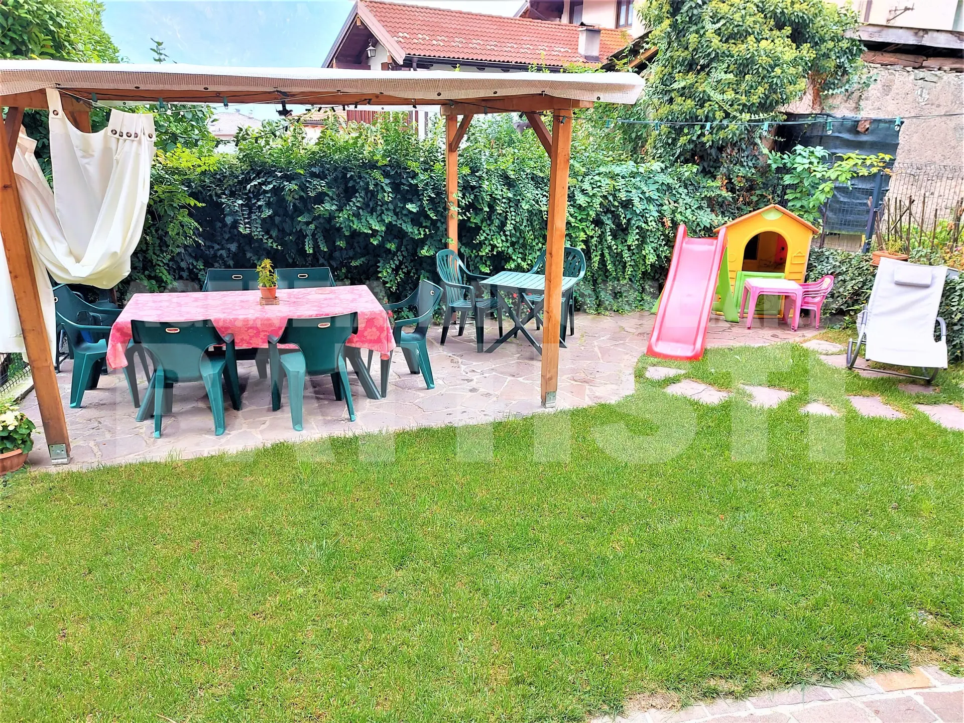 PIANO TERRA: atrio di ingresso, zona giorno con cucina completa con accesso al giardino, particolarmente riservato ed accogliente, stanza matrimoniale con bagno privato + locale tecnico uso lavanderia e centrale termica.
